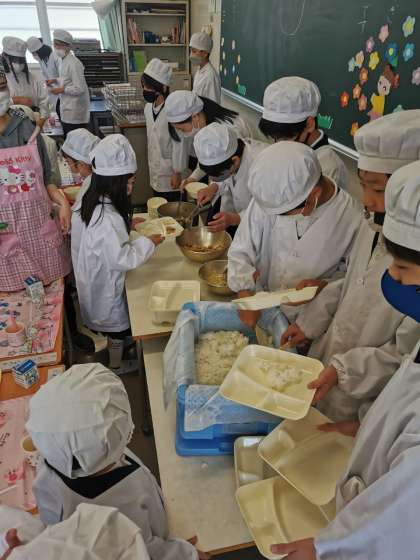 6年生が配膳のお手伝いをしてくれていますが、食べる量を聞いて調節してくれたり、牛乳を飲む用意をサポートしてくれたりしています。