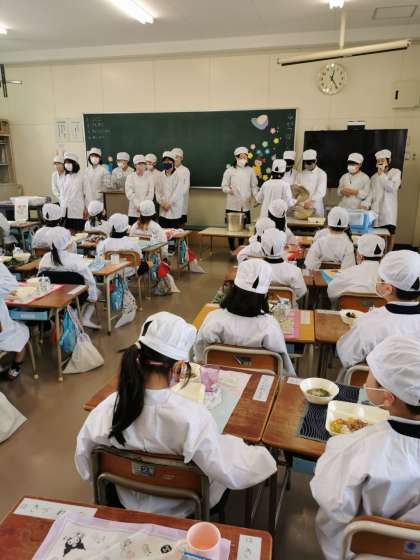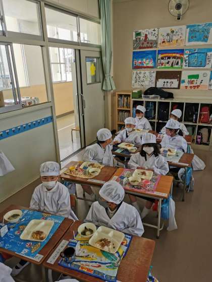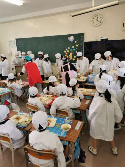 今日の献立はビビンバとトックです。6年生がお手伝いをしてくれています。まだスプーン持ったらだめだよと、声をかけてくれたりストローの用意を手伝ってくれたりしています。
