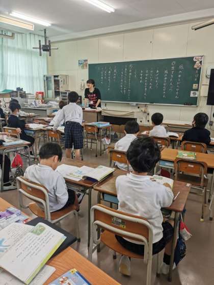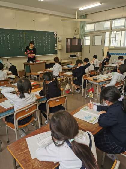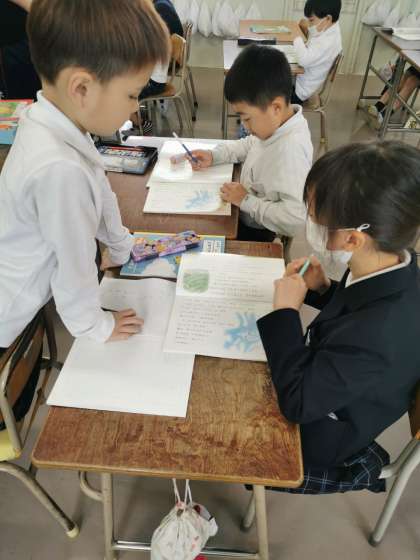風のゆうびんやさんのお話を読んでいます。誰が出てきたか、お話をまとまりで分けると、といったことをしています。