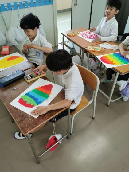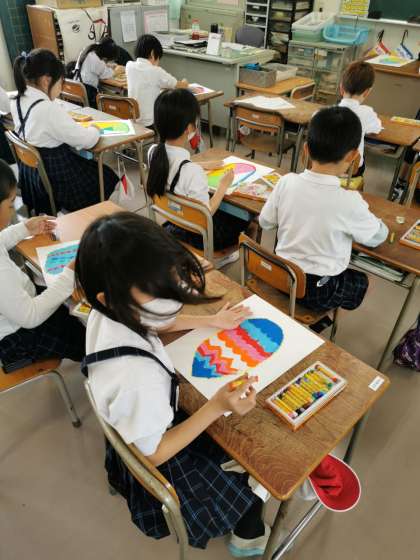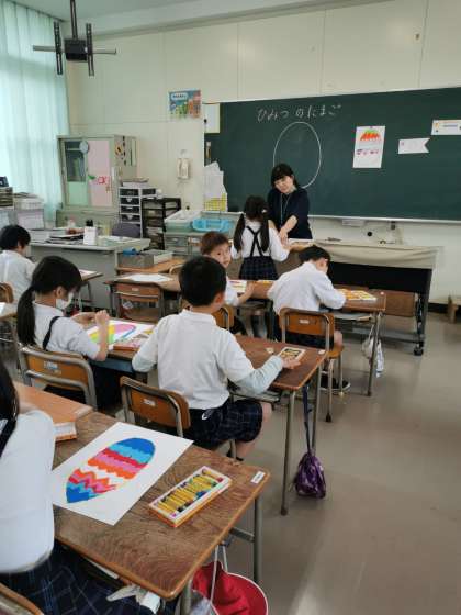 「秘密の卵」を描いています。クレパスでしっかり塗り込んでいます。