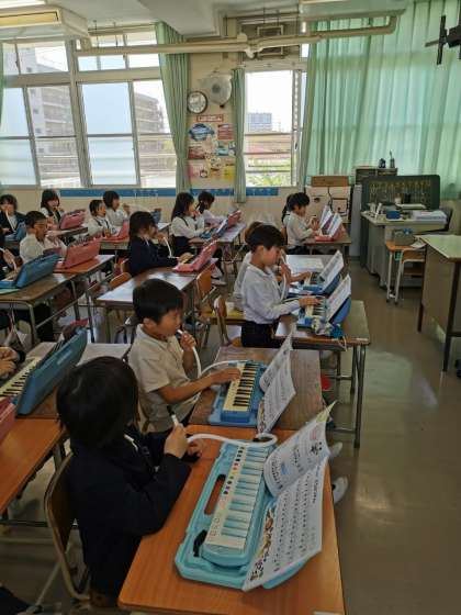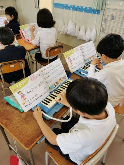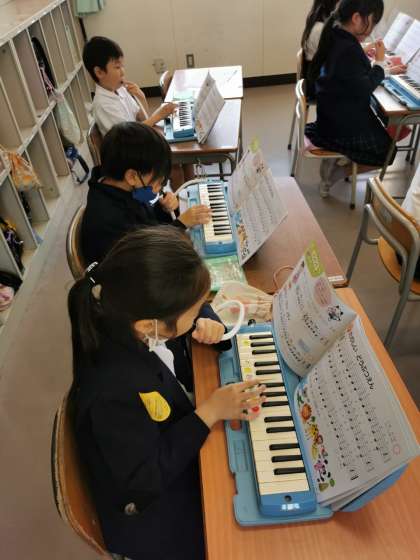 鍵盤ハーモニカの練習中。ドレミファのファで親指を押さえる練習をしています。