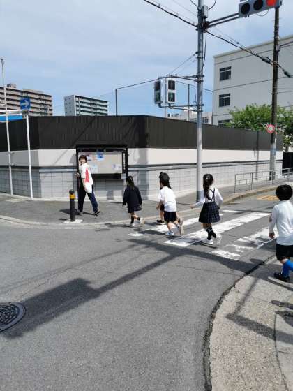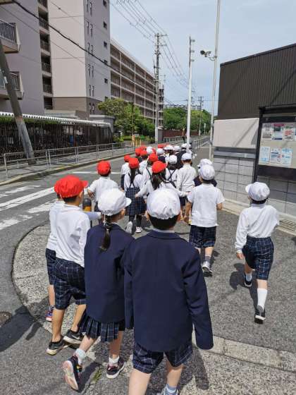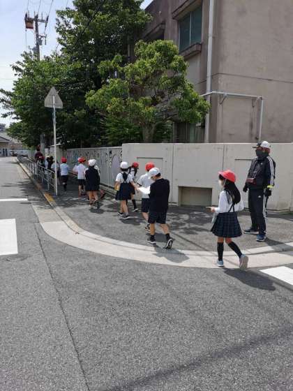 学校の近くを歩きながら、学年それぞれで安全な歩行について考えていました。