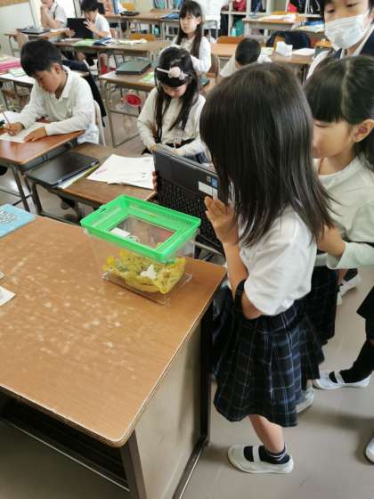 チョウのさなぎを撮影しています。順調に育っています。
