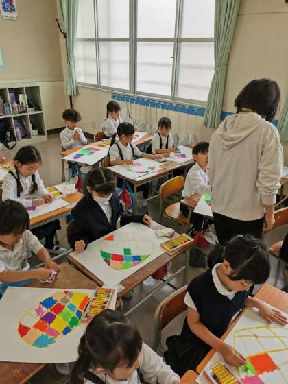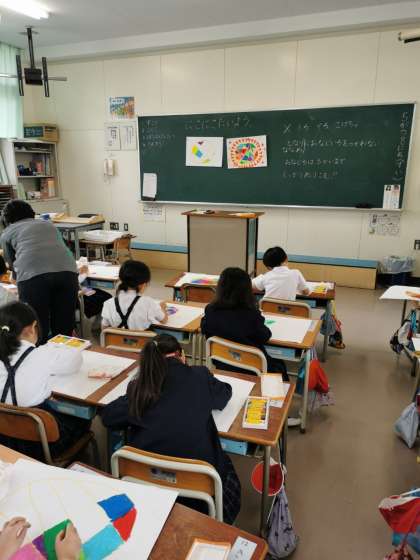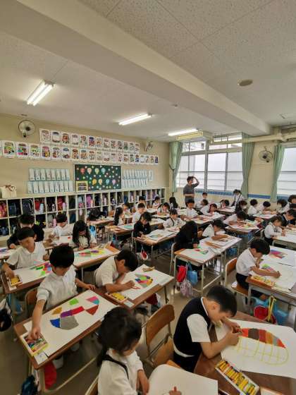 クレパスで「にこにこたいよう」をかいています。みんな集中しています。