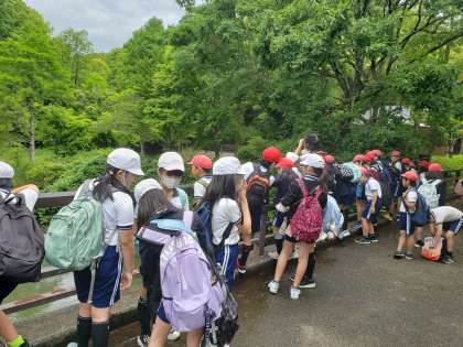甲山森林公園の池のそばで一休み。「あっ、カメがいた。」と子どもたちは大喜び。