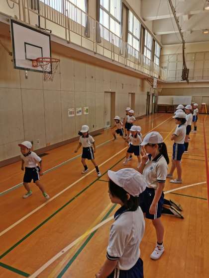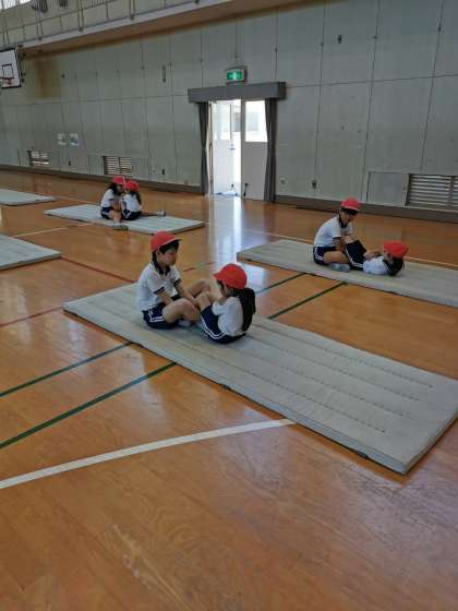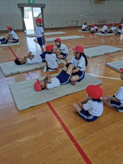 上体起こしと反復横跳びを1年と6年とで計測しています。6年生はとてもやさしいです。