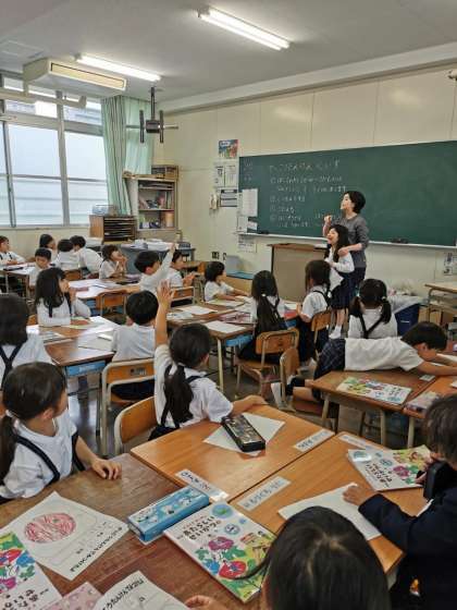 この前行った学校探検でみつけたものを発表しています。みんなからの質問にも答えています。