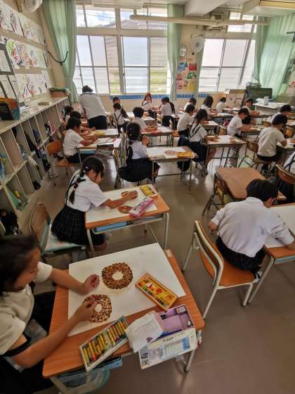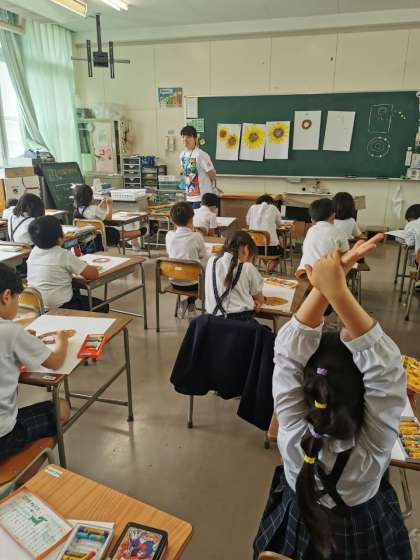 クレパスで花を描いています。とてもしっかり塗り込んでいます。疲れてくるので少し休憩もしながら進めています。