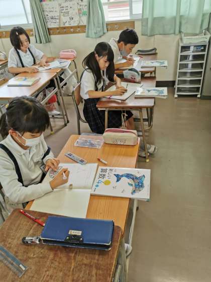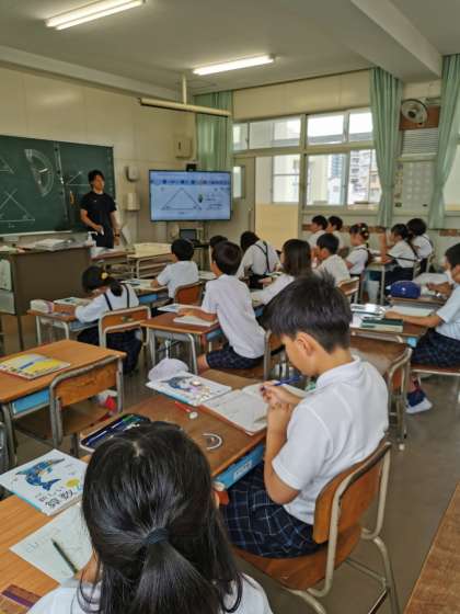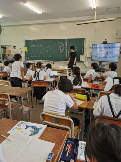 分度器を使って三角形を描いています。もっと難しいのでも大丈夫、とどんどんいろんな三角形を描いています。