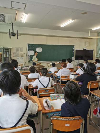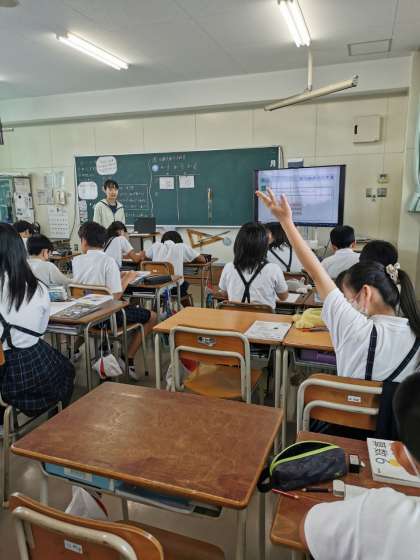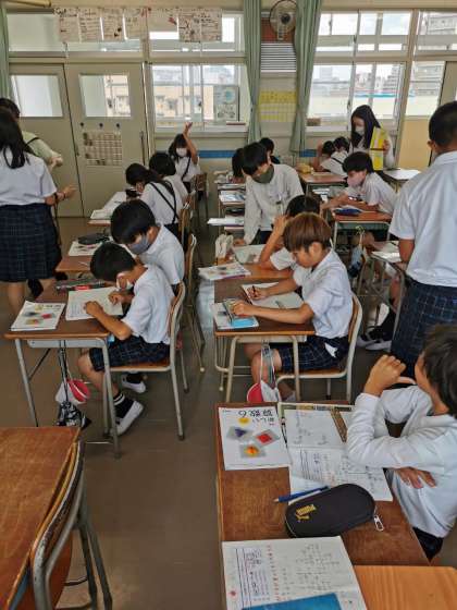 計算のきまりを使っていろんな分数の計算をしています。考え方が腑に落ちないという子は近くの子に聞いています。