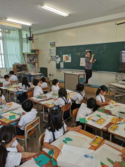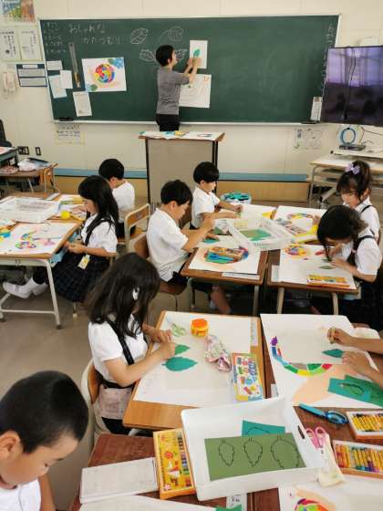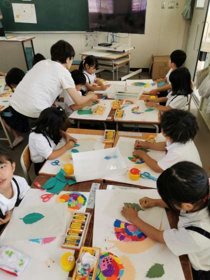 「おしゃれなかたつむり」を描いています。今日は絵の中に出てくる葉っぱを作っています。