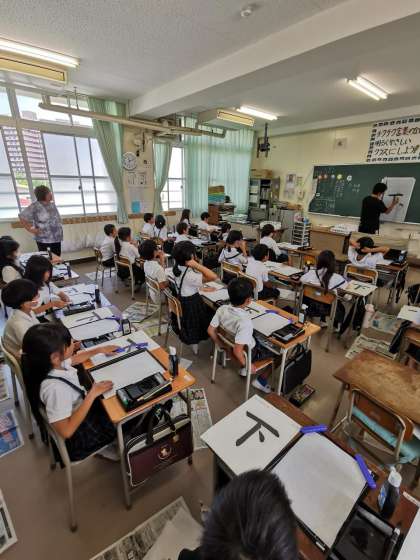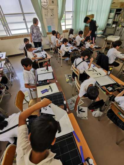 習字で「下」を書いています。名前とあわせて繰り返し練習しています。