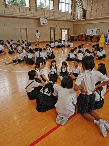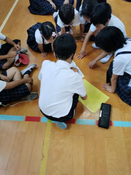 明日の歌島まつりは縦割り班でお店を回ります。今日の児童集会ではお店をどういう順番で回っていくか、明日の相談をしました。