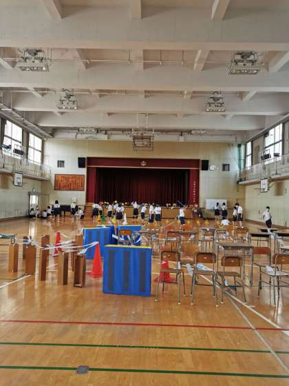 教室や講堂での準備を学級それぞれで進めています。明日はみんなで楽しい一日になるようにがんばりましょう。