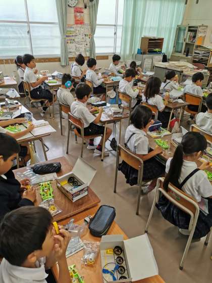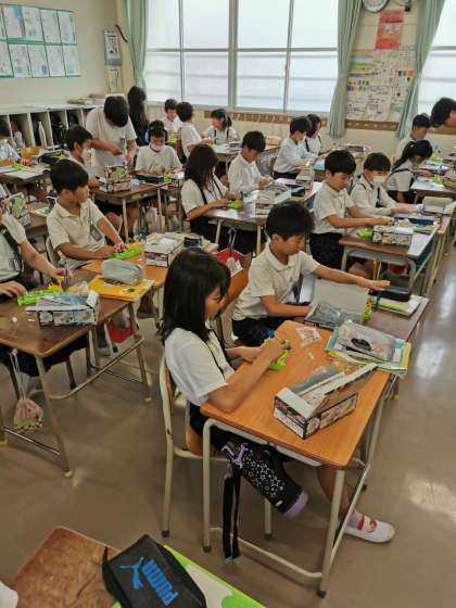 キットを使って回路を作っています。キットを活用し、電気の通り道を考えながら作っています。