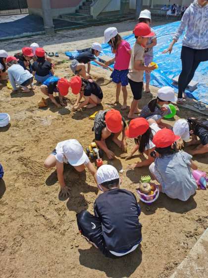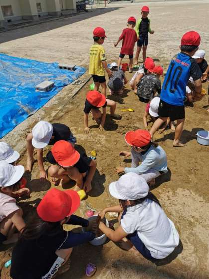 砂団子を作ったり、大きな穴をほったり、共同作業でいろんなものを作ったりしています。