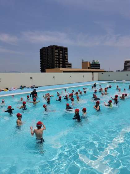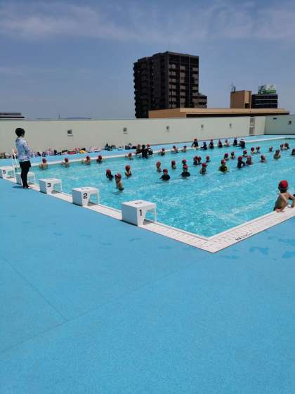 今日ようやくプールに入りました。プールへの入り方を覚えたり、静かに話を聞くといったルールの確認をしたりしました。