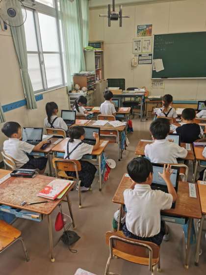 学習者用端末を使って心の天気を入力したりデジタルドリルで問題を解いたりしています。短い時間で用意してやり始めています。