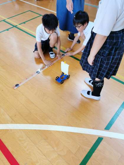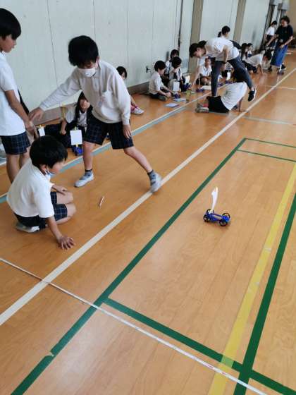 サーキュレーターを使った実験をしています。風の強さと車の動いた距離との関係を確かめています。