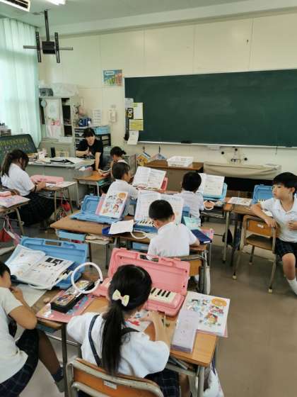 鍵盤ハーモニカのテストをしています。待っている間も学習をして静かにしています。