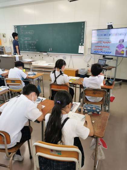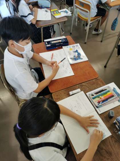 図を活用して数の違いに着目して問題をかんがえる、という少し難しい問題に取り組んでいます。頭を抱えながらああかな、こうかな、とノートに考えを書いて式と答えを書いています。