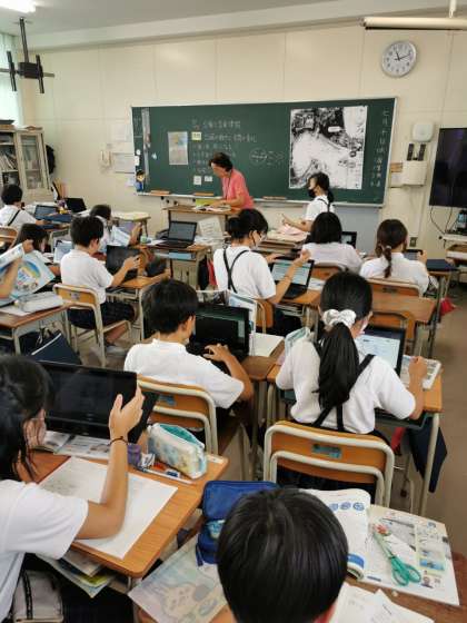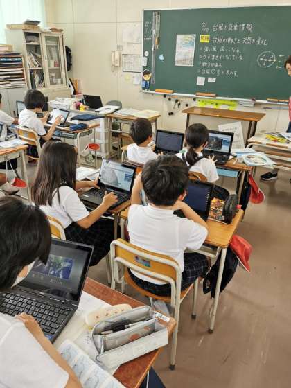 台風と気象情報の学習をしています。台風のしくみや雲の流れなど学習者用端末を使って確認しています。