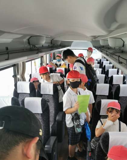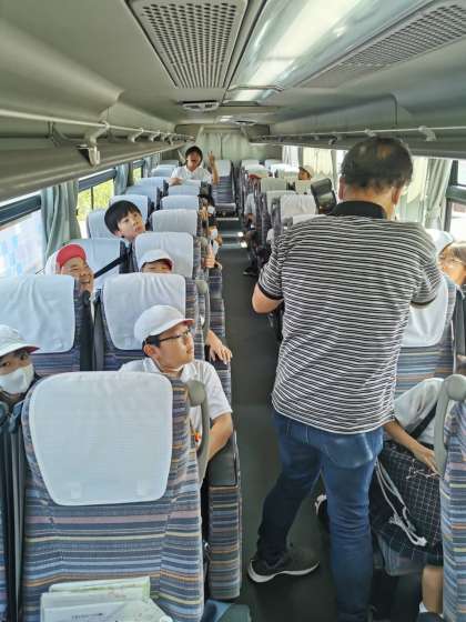 バスは途中渋滞にあい少し時間がかかりましたが、二度のトイレ休憩を終え、ハチ高原に向かっています。車中ではキャンプファイヤーで歌う歌を歌ったり、用意してきたクイズをしたりして過ごしています。