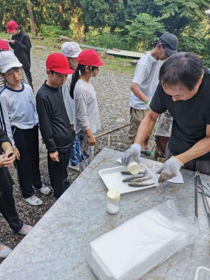 捕まえた魚はおいしくいただきました。苦みのあるところも食べている子がいました。なかなかできない経験ができました。