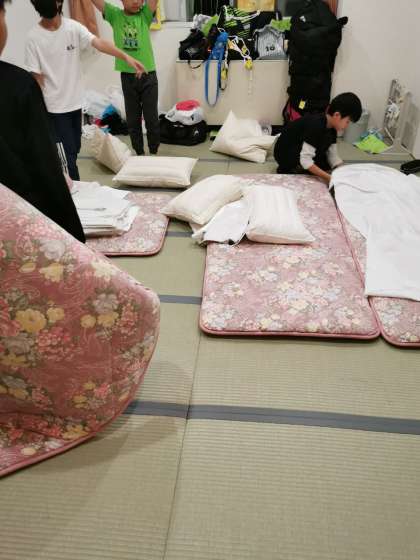 就寝準備中です。どこに布団をしこうか、シーツはどうやってしけばいいのか、はたまた歯を磨かないと、荷物を片付けないと、といろいろとやることがあります。