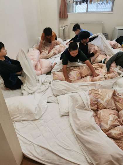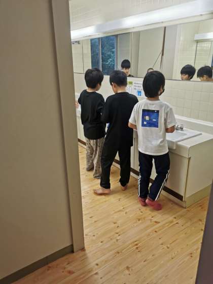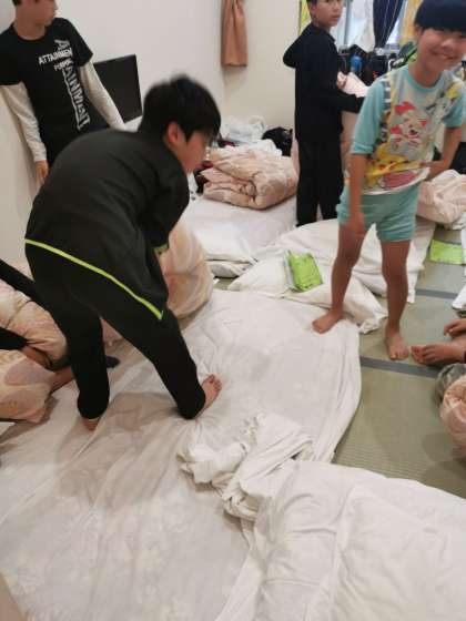 雷を伴う強い雨が降りました。雨がまた降るという想定で動きます。子どもたちは雷で起きた子もいるようです。起床後朝の用意をしています。