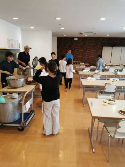 続いて夕食。トンカツです。食事係がばりばりお仕事してくれています。