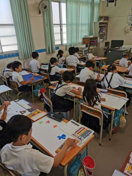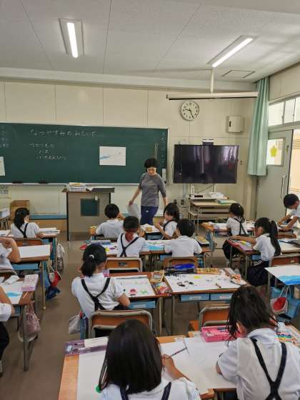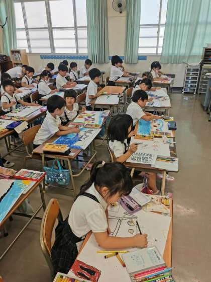 夏休みのことを絵にしています。いろんな思い出があったようです。色鉛筆やクレパスで一生懸命描いています。