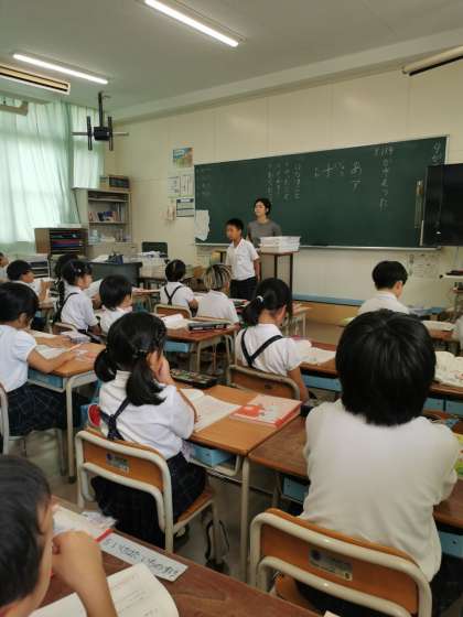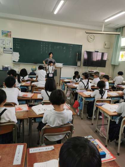 夏休みの思い出の発表をしています。発表のあと、質問に答えています。みんか静かに聞いています。