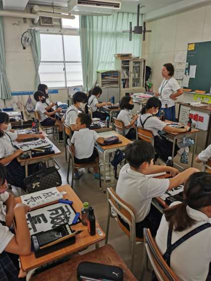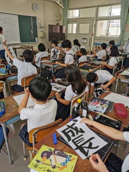 「成長」の字を毛筆で練習しています。字のバランス、線の長さなどに気をつけて書いています。