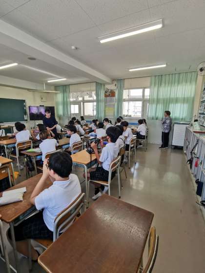 佐々木禎子さんと折り鶴にまつわる絵本の読み聞かせを聞いています。その後これから学習していきたいこと、取り組んでいきたいことを考えました。そして折鶴を作っていくことを決めました。