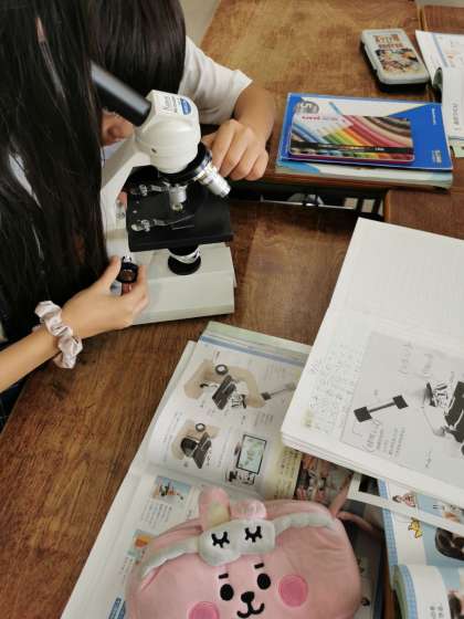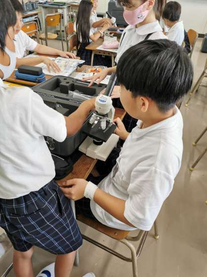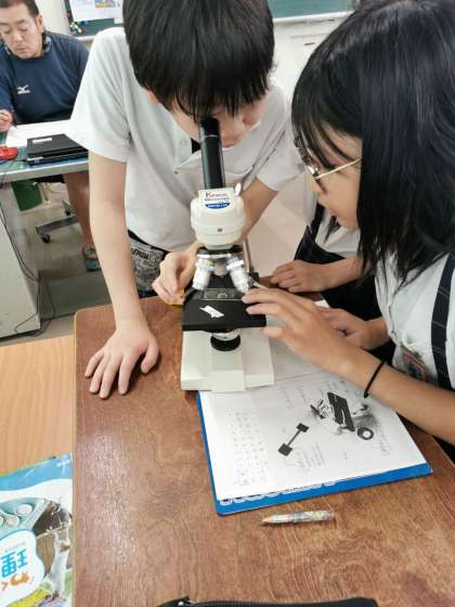 顕微鏡を使ってヘチマの花粉の観察をしています。思っていた以上にクリアに見えたようです。興奮した様子でレンズを見ています。