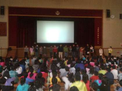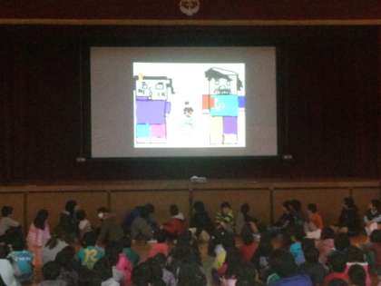 今日は、児童集会の日です。パソコンクラブの児童たちが、グループで創作したデジタル紙芝居を発表しました。