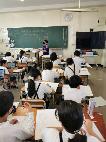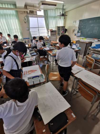 この夏のそれぞれの思い出の景色を絵にしています。遠近法ということですがいろいろと工夫して遠くの物を描いたり、建物を描いたりしています。