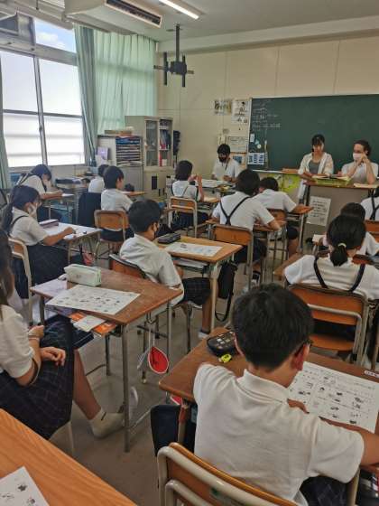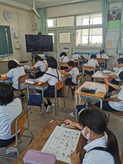 テストをしています。リスニングしながらプリントに答えを書いています。
