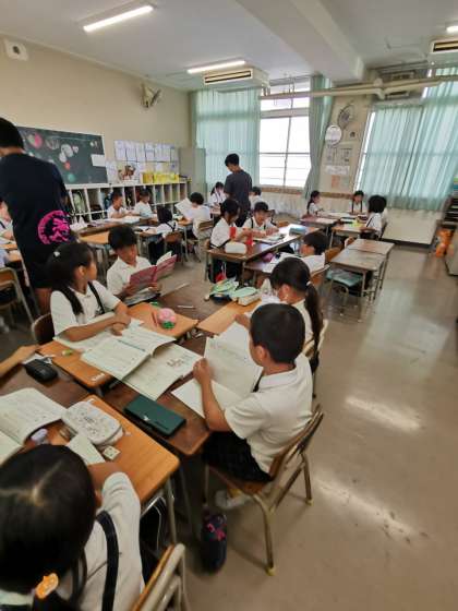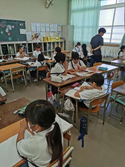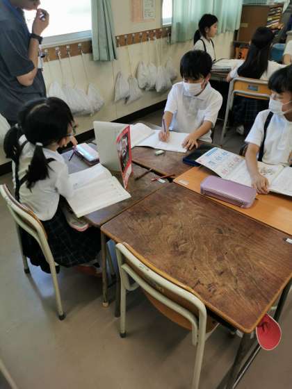 グループの合言葉をつくろうという学習をしています。班でそれぞれ意見を出し合って相談しています。