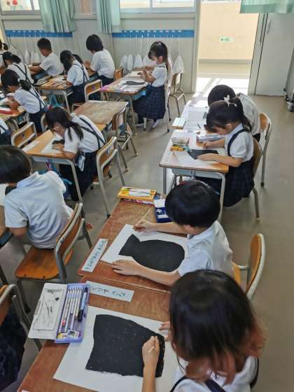 クレパスでいろいろと塗ったあと黒一色にしました。そのあと細い棒で削り始めました。とてもきれいな絵が描けて喜んでいました。