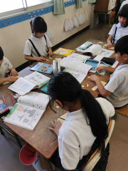 いろんな図形を組み合わせて形を作っています。最初は教科書のお手本どおりに、そのあと自分で考えた形を作っています。