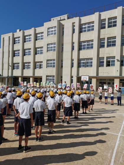 今朝の児童集会では、代表委員から運動会のスローガン発表がありました。「紅白かまわず駆け抜けろ 今日の主役は君たちだ」と力強い言葉になりました。