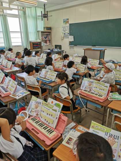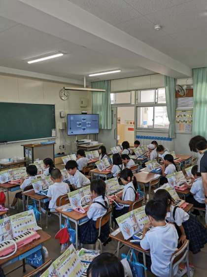 鍵盤ハーモニカの練習をしています。隣同士で指の使い方ができているか確認しています。