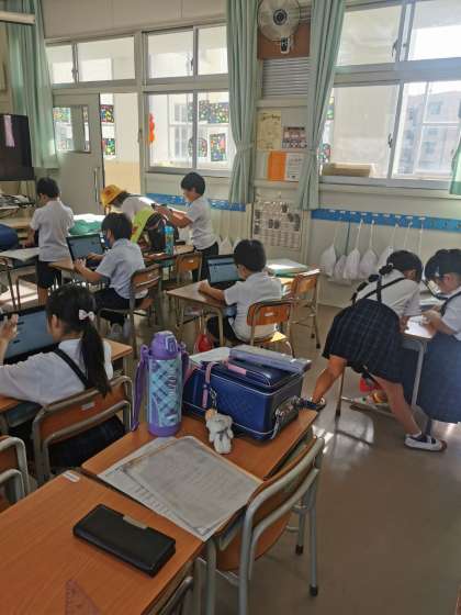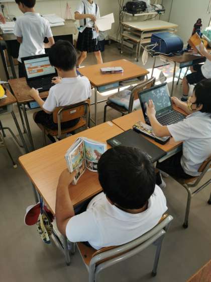 先生が来るまでに、子どもたちはそれぞれにやるべきことをしているようです。本を読んだり、教えあって問題を解いたり、デジタルドリルをしたりしています。