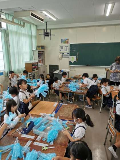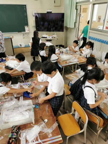 団体演技で使う道具を作っています。リボンやキラキラしたテープをはっていました。本番でさらに華やかな雰囲気になるでしょう。