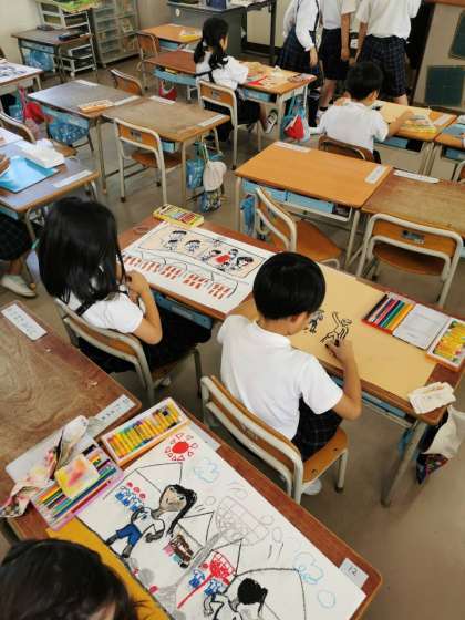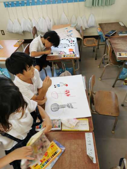 運動会のときのことを絵にしました。クレパスで大きく描いています。
