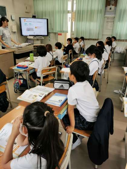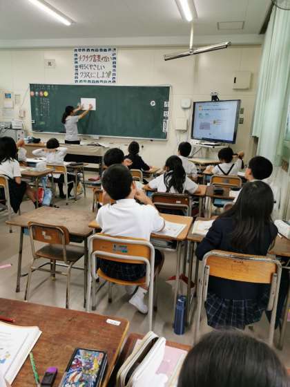今日は運動場の地面で温度を測ります。3分間計測します。あらためて温度計の使い方を確認しています。