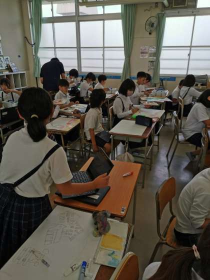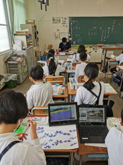 自然をモチーフにした絵を描いています。花を描いたり林間学習で泊まった宿舎を描いたりしています。