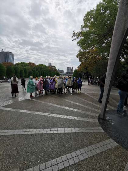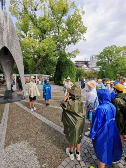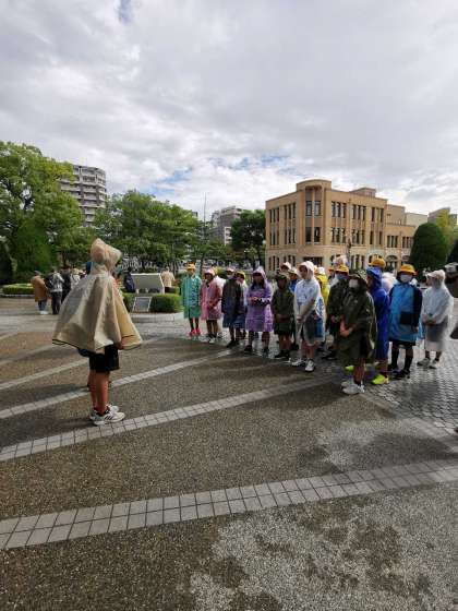 平和の誓いのセレモニーをしました。歌島小学校で作ってきた折り鶴を捧げました。